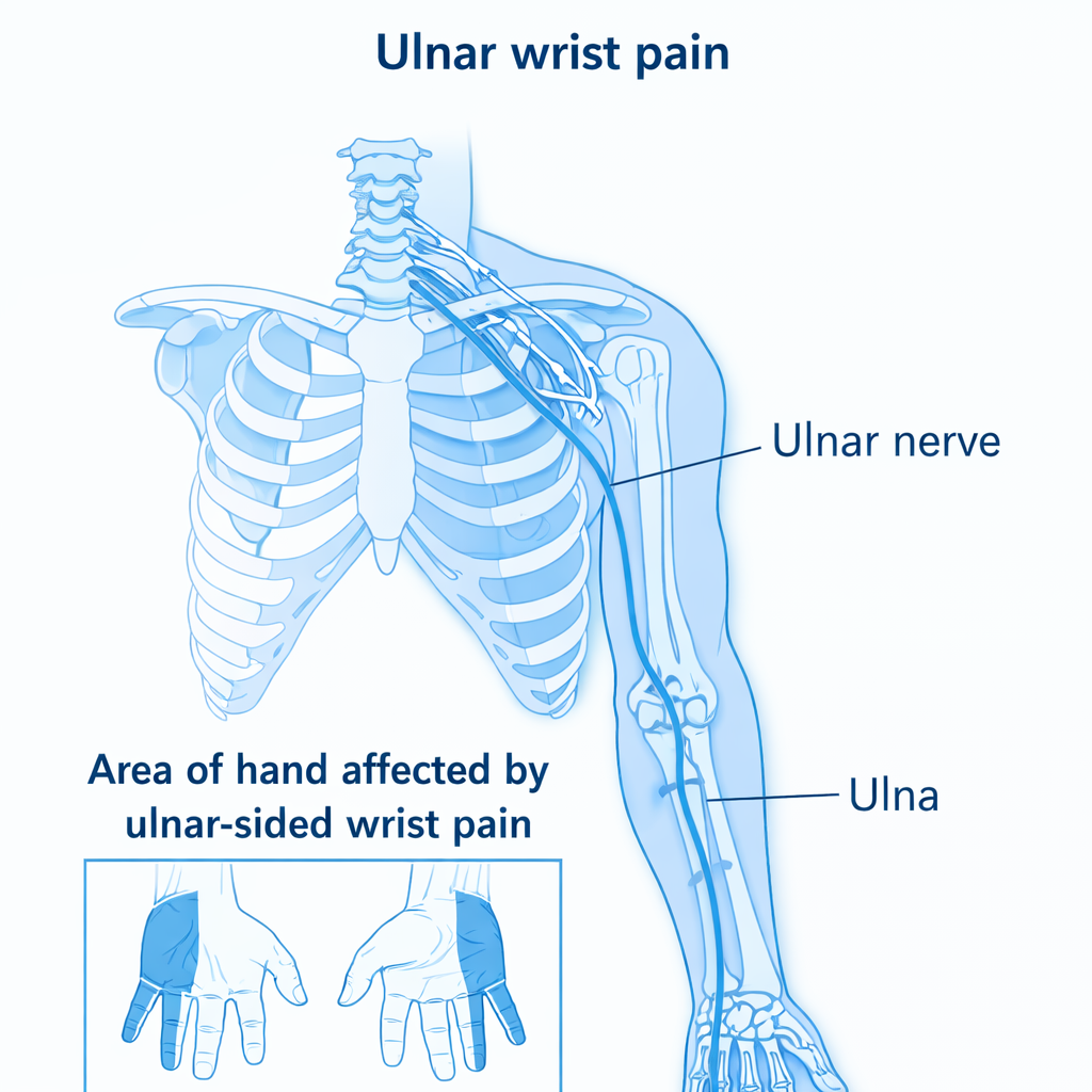 Ulnar wrist pain refers to discomfort on the side of the wrist near the little finger. The term comes from the ulna bone in the forearm. This area contains many bones, ligaments, tendons, and nerves that support hand movement. Because of its complex structure, injuries, repetitive strain, or trauma can cause wrist pain in this region.
